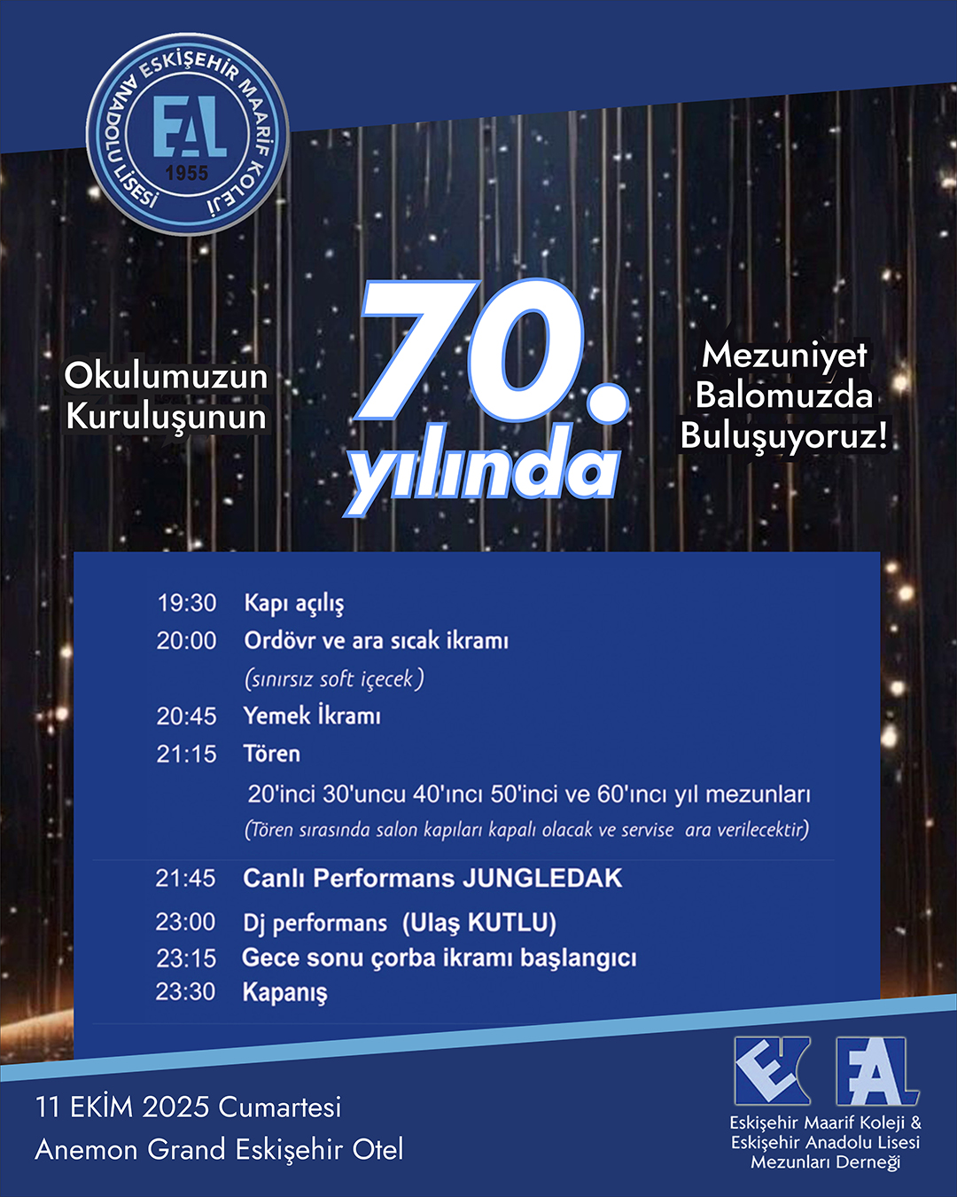 Bu sene 11 Ekim tarihinde gerçekleşecek olan geleneksel balomuza dair hazırlıklarımız tüm hızıyla devam etmektedir. Eskileri yad edeceğimiz, hasretleri bir nebze de olsa dindireceğimiz bu güzel gecede tüm mezunlarımızı aramızda görmekten mutluluk duyacağız. 11 ekim tarihinde Anemon Otel’de düzenlenecek balo ile ilgili tüm detaylar aşağıdaki online bilet linkinde bulunmaktadır. Ayrıca kapıda da bilet satışı olacaktır. Ancak katılım sayısını öngörmek ve daha düzenli bir yerleşim planı düzenlemek adına onlıne bilet almanız tercihimiz olacaktır.