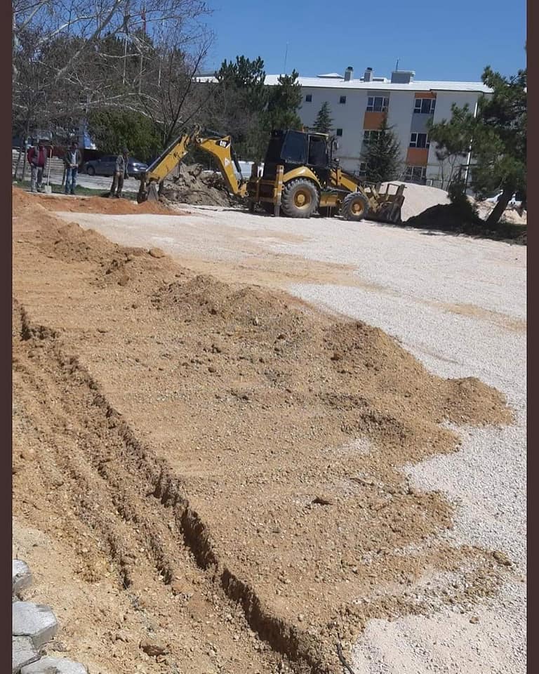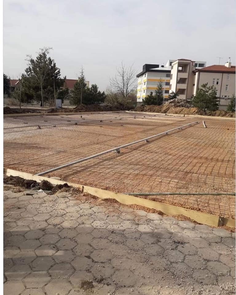 Okul bahçesindeki yeni açık saha için gösterilen alanın tesviyesi ve sıkıştırılmasından sonra çelik hasır üzerine beton dökümü tamamlandı.